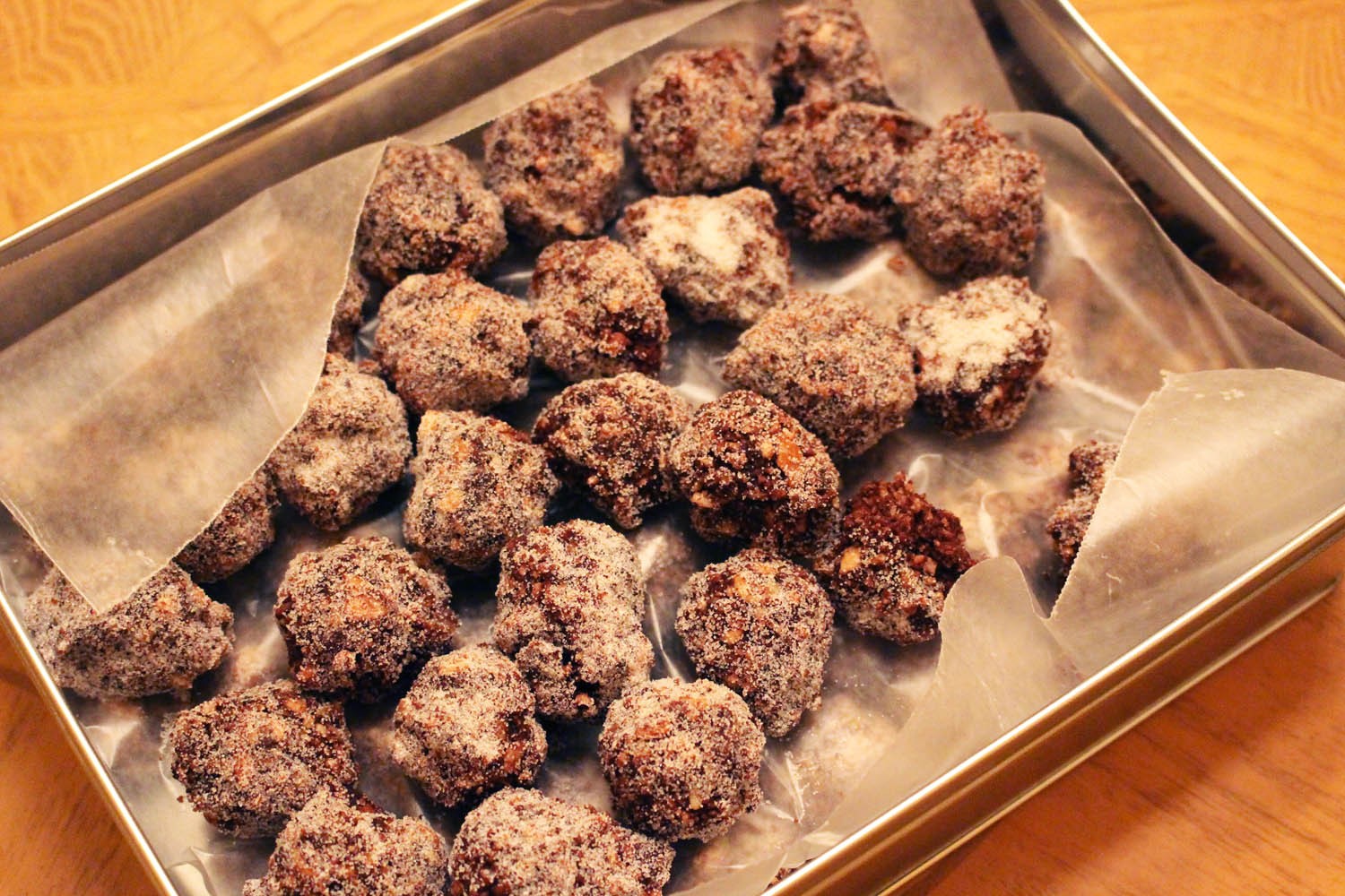 I have never been to a cookie exchange. Last year, I had been invited to one but it was cancelled due to lack of interest. Of course the month of December is a very hectic time of year. So part of an exchange is bringing cookies to exchange. So I bought my tickets for this event back in September and I decided o make Amaretto balls. The only problem is, I can’t go, so my daughter J. will go in my place with my ticket. I am still making the cookies for the event for her to take. I am making one of my favorite cookies – Amaretto balls. The key is to make them ahead of time, so they have time to cure. They are tasty freshly made, but if they are stored in a metal cookie tin, this treatment causes the Amaretto to really pop. My DH’s Aunt M. was known for her bourbon balls that she made every year for Chanukah. She would grind her nuts very, very finely. The first batch I made was at 1:00 AM, three nights ago and because everyone else was sleeping, I decided to grind almonds in our sunroom to help cut down on the noise. The only problem, is I couldn’t get them as fine as I needed. I made the balls anyway, but had difficulty making them into balls. So the next night, I made a second batch which had a mixture of almonds and pecans. I was able to grind them more finely then the first batch, however, I usually buy almonds ground at the local Amish market. While helping out at our flea market, I asked MIL to fetch me that kind. So tonight I attempted to make another batch of the balls, this time with the extra fine ground almonds. The fine ground almonds is the secret to success. Okay, the real secret of success is having all of the correct ingredients. I ran out of vanilla wafers, so I decided to sub crispy rice cereal for the cookies. It did not work to make the Amaretto balls, however, it does make a great adult ice cream topping. This week I will post the recipe for the Amaretto balls just in time for the holidays as well as the ice cream topping.