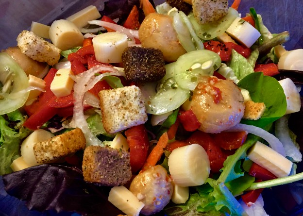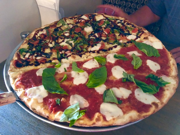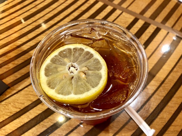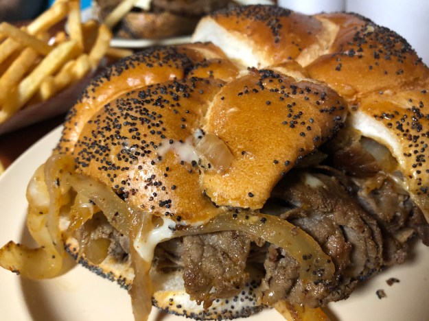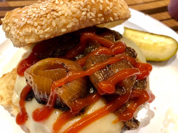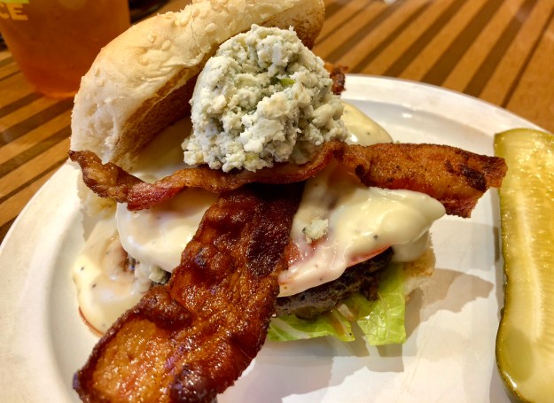 The restaurant wasn’t what I expected. I was surprised to find out that is this place was a combo of order at the counter, and then they bring the food to you. The place wasn’t crowded at all, maybe a handful of people. I attributed this to be a result of the time of day, a Friday late afternoon and a college campus. I ordered the Philly Burger mid rare without the jalapeños. It consisted of a beef burger with provolone cheese and caramelized onions on a sesame seeded roll, with a dill pickle on the side and an unsweetened iced tea. At first I was going to get the a diet soda, but I wasn’t quite sure if the soda tax applied to it or not. DH ordered the Bobby Bacon & Blue Burger mid rare, which came with two full sized bacon slices, lettuce, tomato, American cheese, topped with a scoop of blue cheese. We also ordered one order of onion rings.