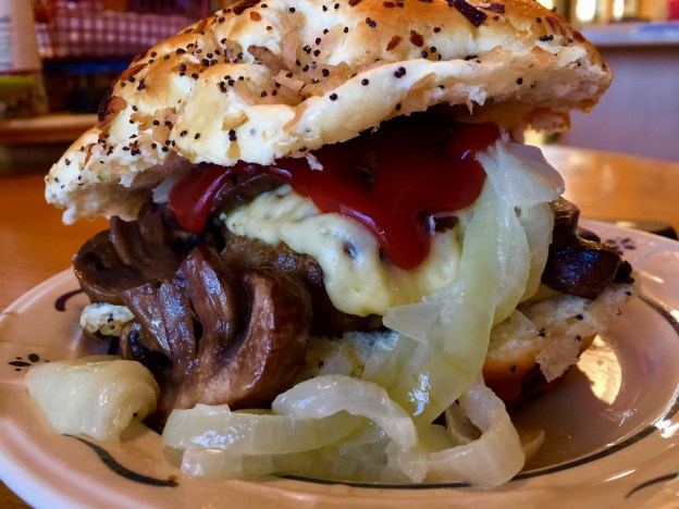 - Place burger on roll with cheese side facing up, then add mushrooms and onions.