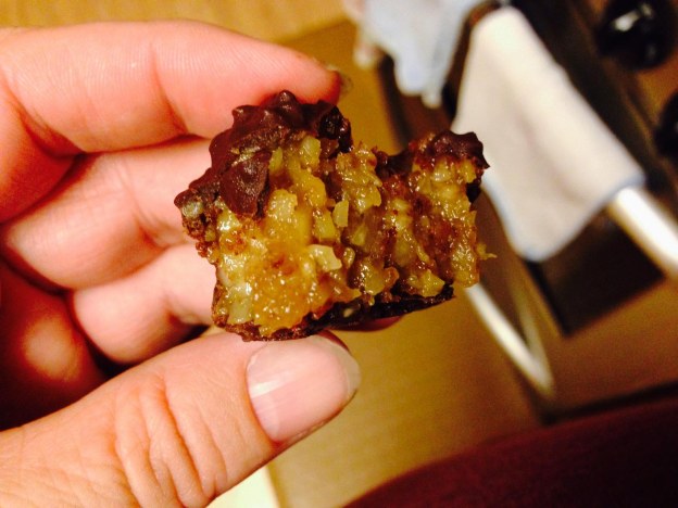 Funny thing is I am actually a milk chocolate fan more so than dark. However, the sweet filling in these delights is enhanced by the fine dark chocolate. I liberated one of MIL’s chocolate bars for this recipe as she always has plenty of these bars on-hand. She breaks up the chocolate bars into bite sized pieces and keeps them in the freezer. She refers to them as her vitamins.