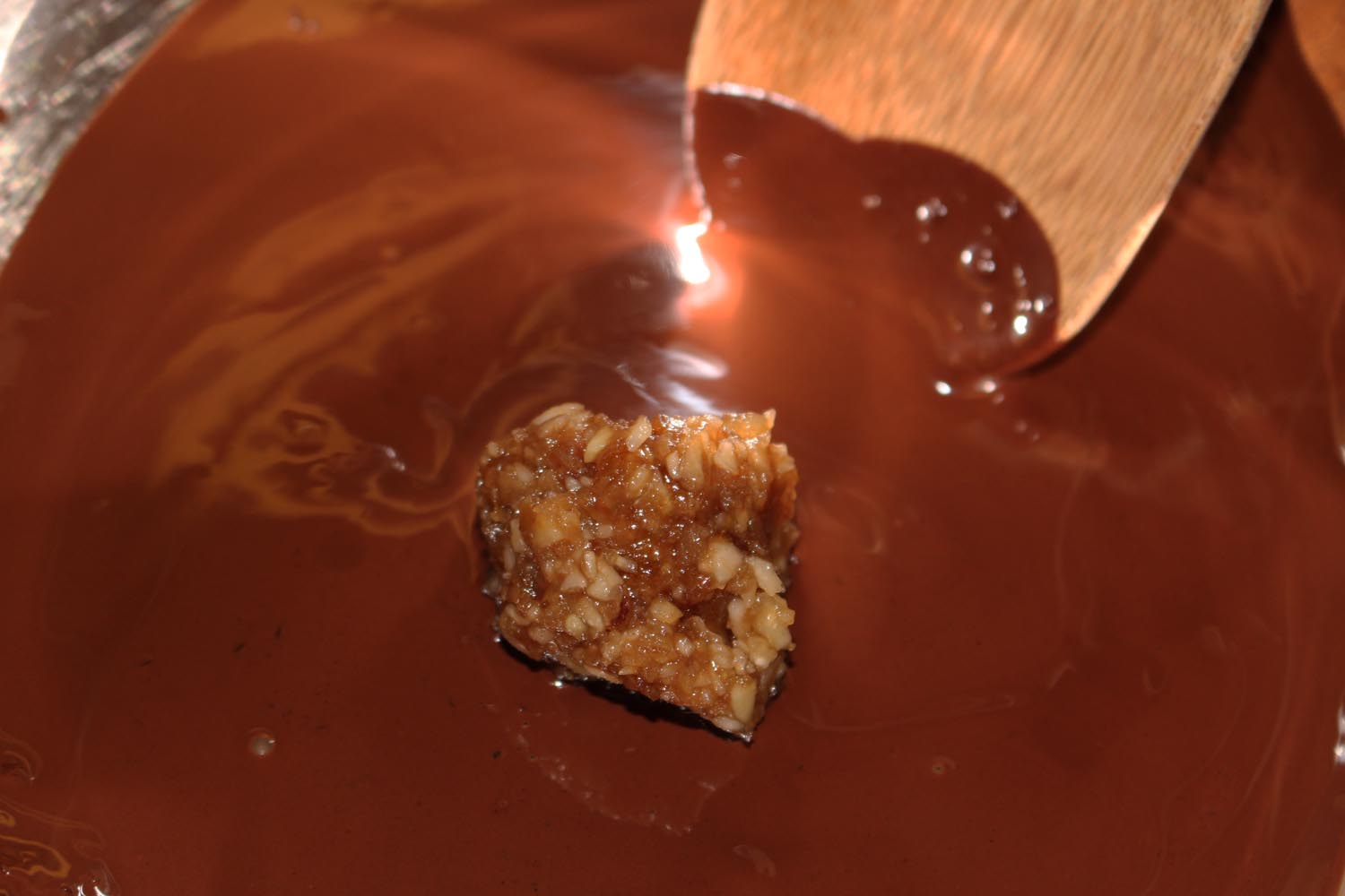 - Add one at a time to the chocolate, gently covering it in chocolate.
