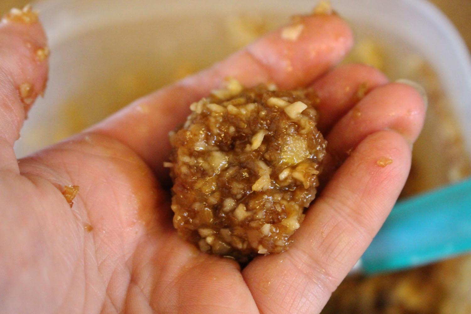 - Wet your hands and form bite sized (or desired size) balls of the date mixture. (I made two sizes).