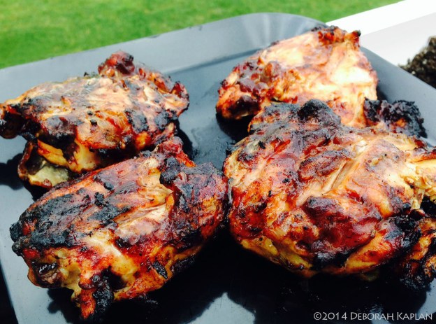 There are certain sounds that take me back to my care free summers as a child, and one of those sounds is the drone of a propeller air plane. I just heard it and it, reminded me of a long time ago when my Dad would grill whole chickens on the rotisseri over a charcoal grill. My Mom and Sister only ate white meat and my Dad and I only liked dark meat (well, not really as I liked white meat, but was forced to eat dark.) So when I grew up and married, my DH prefers dark meat. So when we have a whole chicken, I finally get to enjoy white meat. However, when I just buy parts, for the most part I buy thighs, as I think they have more flavor and as a rule are more moist. In the past on our gas grill I would cook these with a piece of foil to stop flare ups to prevent charred skin. One late afternoon when I was working at my computer, DH decided to grill the chicken thighs himself. I found out that we didn’t have much traditional barbecue sauce, so I made a quick pairing of two of my favorite flavors. Another team effort!