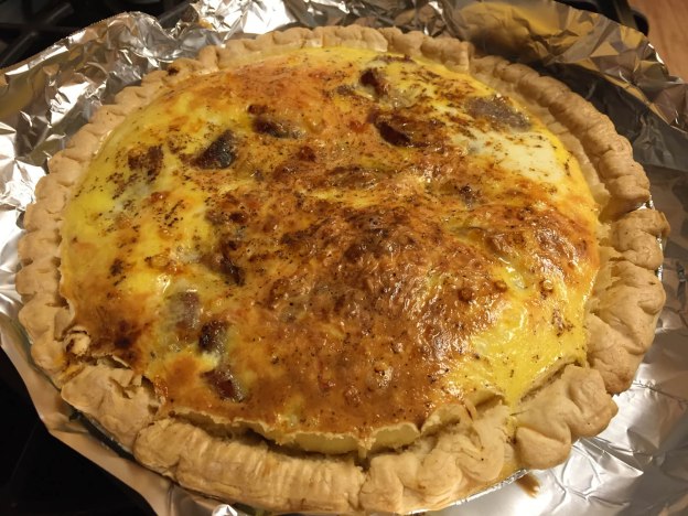 - Place Quiche on a pan with aluminum foil under it, then gently pull up the edges to cover the crust edge so it doesn’t burn.