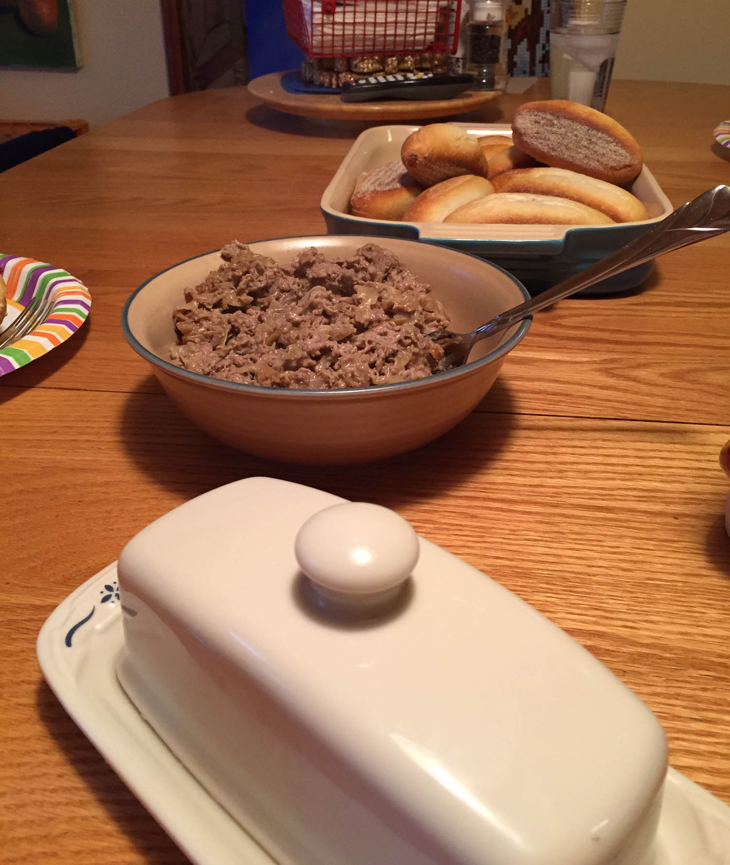 Place rolls with conjoined side down and spread them open. - Divide meat mixture into 8-equal parts and fill each roll with the meat mixture, then close rolls. (Or place a bowl of the meat mixture on the tables so guests can help themselves.)