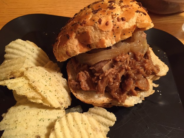 Well, the end result of our labor of pulling the pork was amazing to say the least. The pork was delicious tasting, tender and succulent. The onions that were cooked in the apple juice and sherry were an added bonus to our sandwiches.