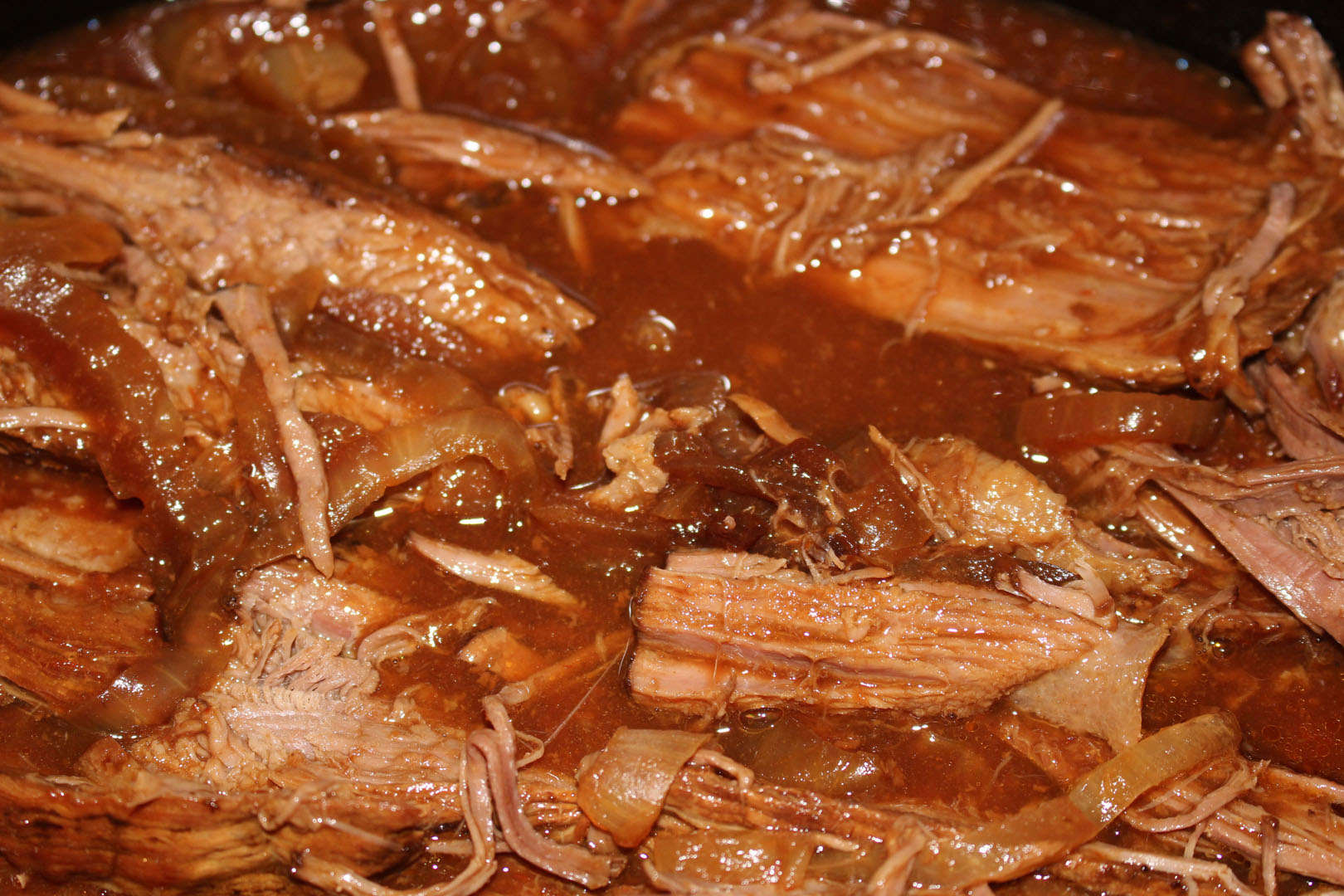 - After the 8 hours, pull the roast out of the crock pot and let it rest for 15 minutes, then slice it across the grain and place the meat back in the crock pot.