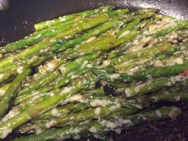 - Add garlic and sprinkle Parmesan cheese over asparagus in the skillet.