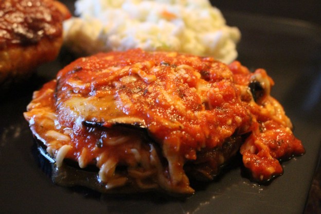 - Slice eggplant cross wise into desired thickness (I cut it about 1/8″ thick but it is not critical).